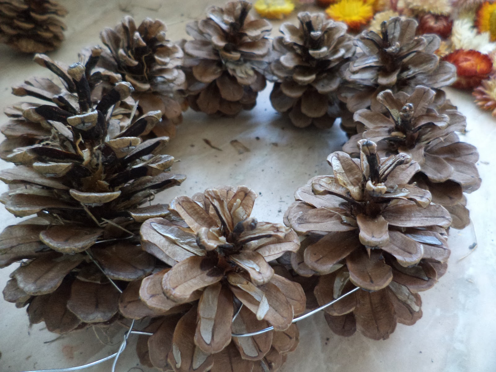 5. A mécses köré kerülnek a szalmarózsák, ragasztóval a lefordított tobozok tetejére (én Technokol-lal ragasztottam)