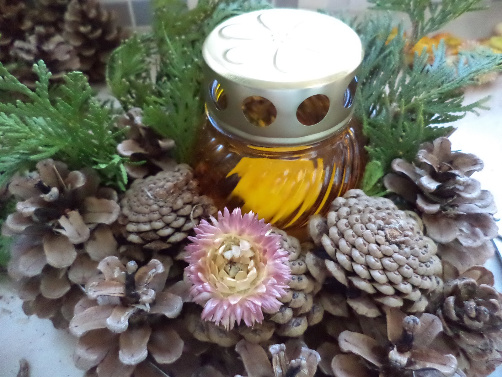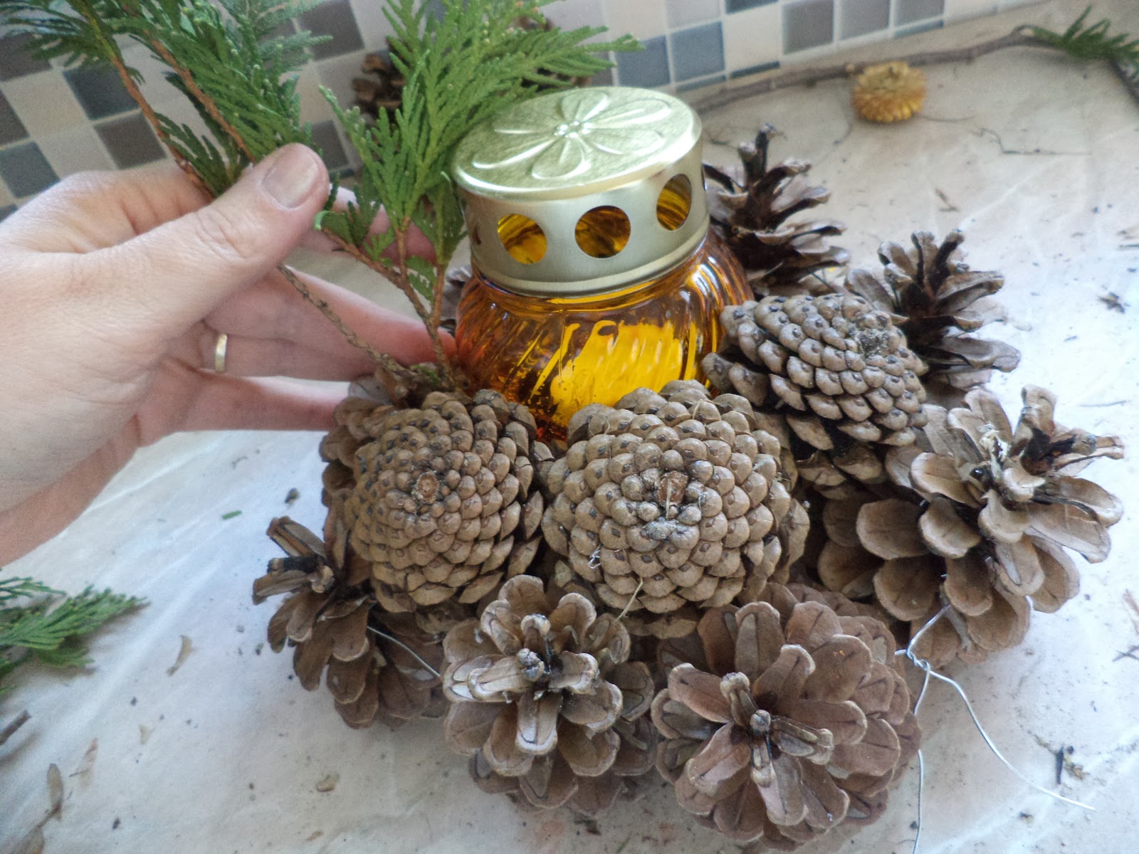 2. A belső kört fejjel lefelé fordított tobozokkal szorosan töltöm meg, annyi helyet hagyok, hogy a mécsest épp, hogy be lehessen még tuszkolni közéjük, majd középre beillesztem a mécsest.